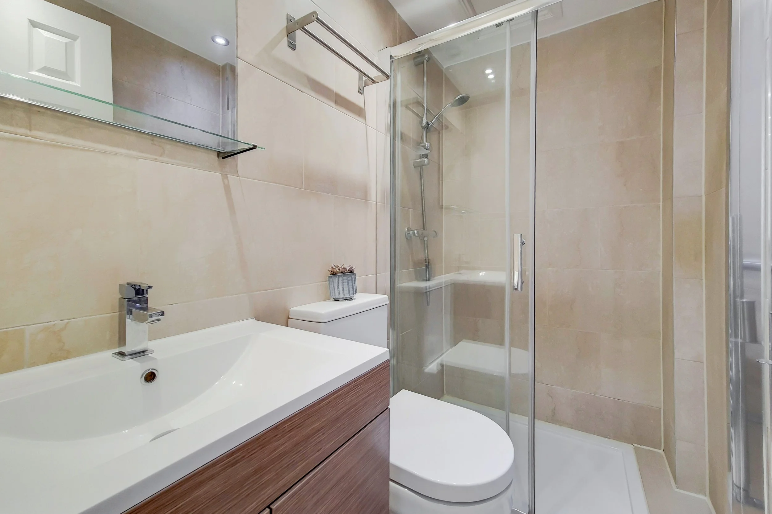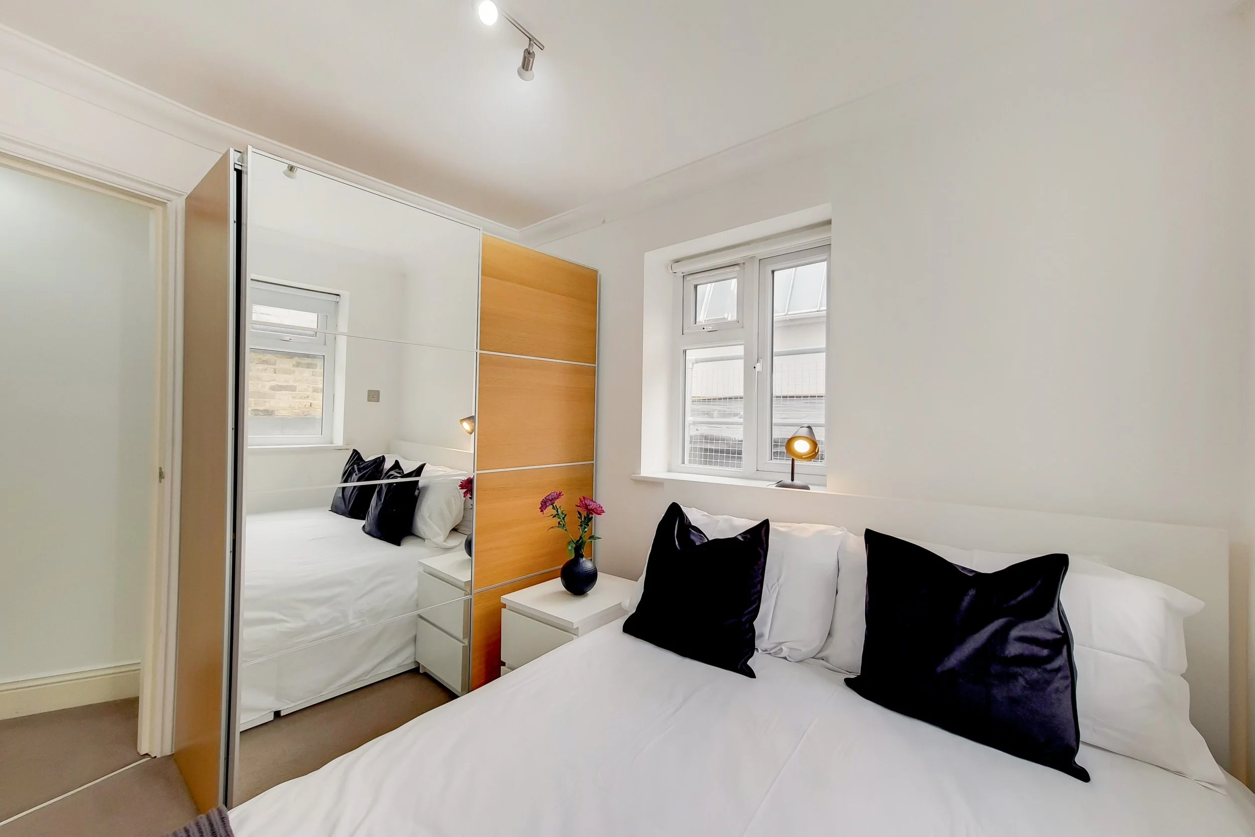 The stylish and modern flat benefits from a spacious reception and kitchen area. This contemporary property is offered furnished: dining table which seats four, four seater sofa, as well as a stylish coffee table. The living space benefits from wooden floors and the large windows create a bright, sunlit space.