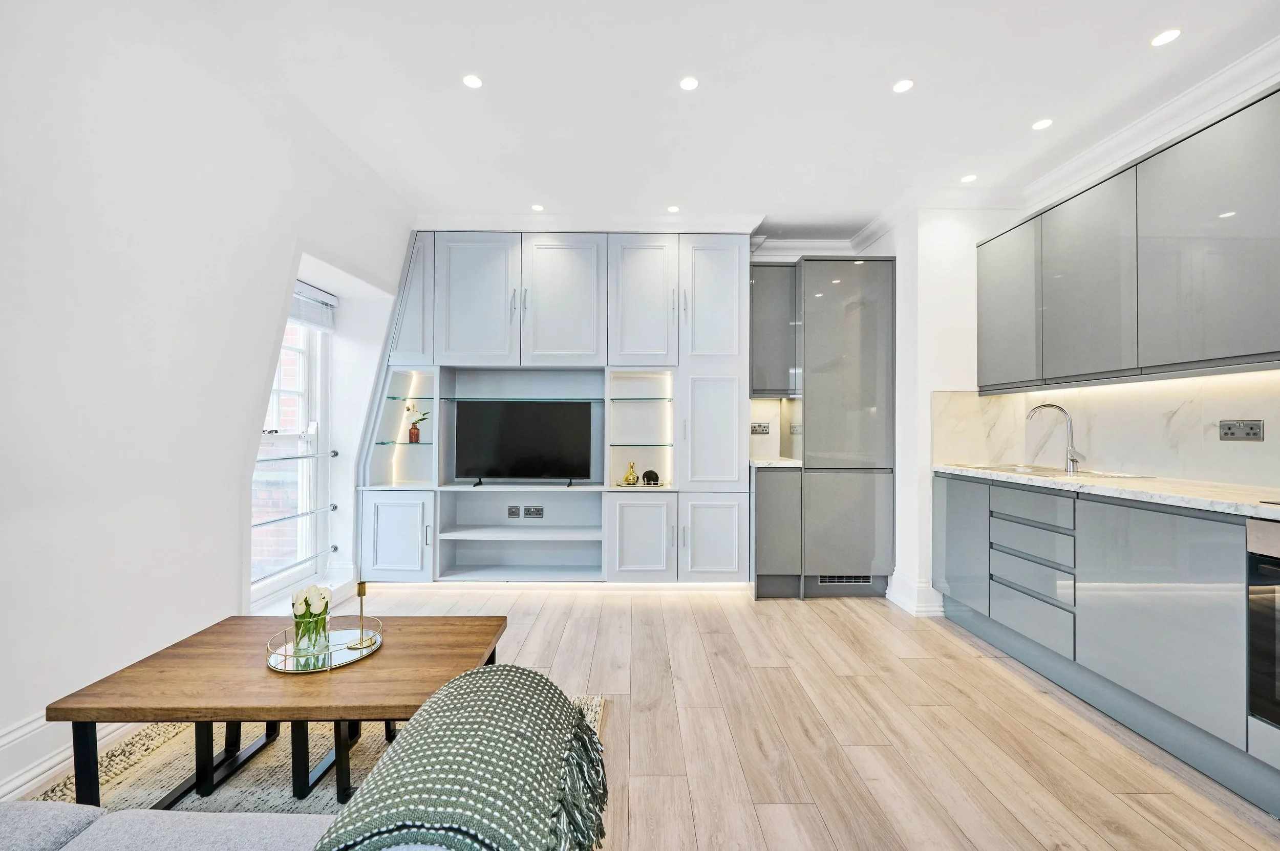 The flat features wood flooring, a flat-screen TV, sofa, coffee table, desk and chair, modern Ottoman double bed, and ample cupboard space. The kitchen is fully equipped with a washer/dryer, hob cooker, oven, fridge/freezer.